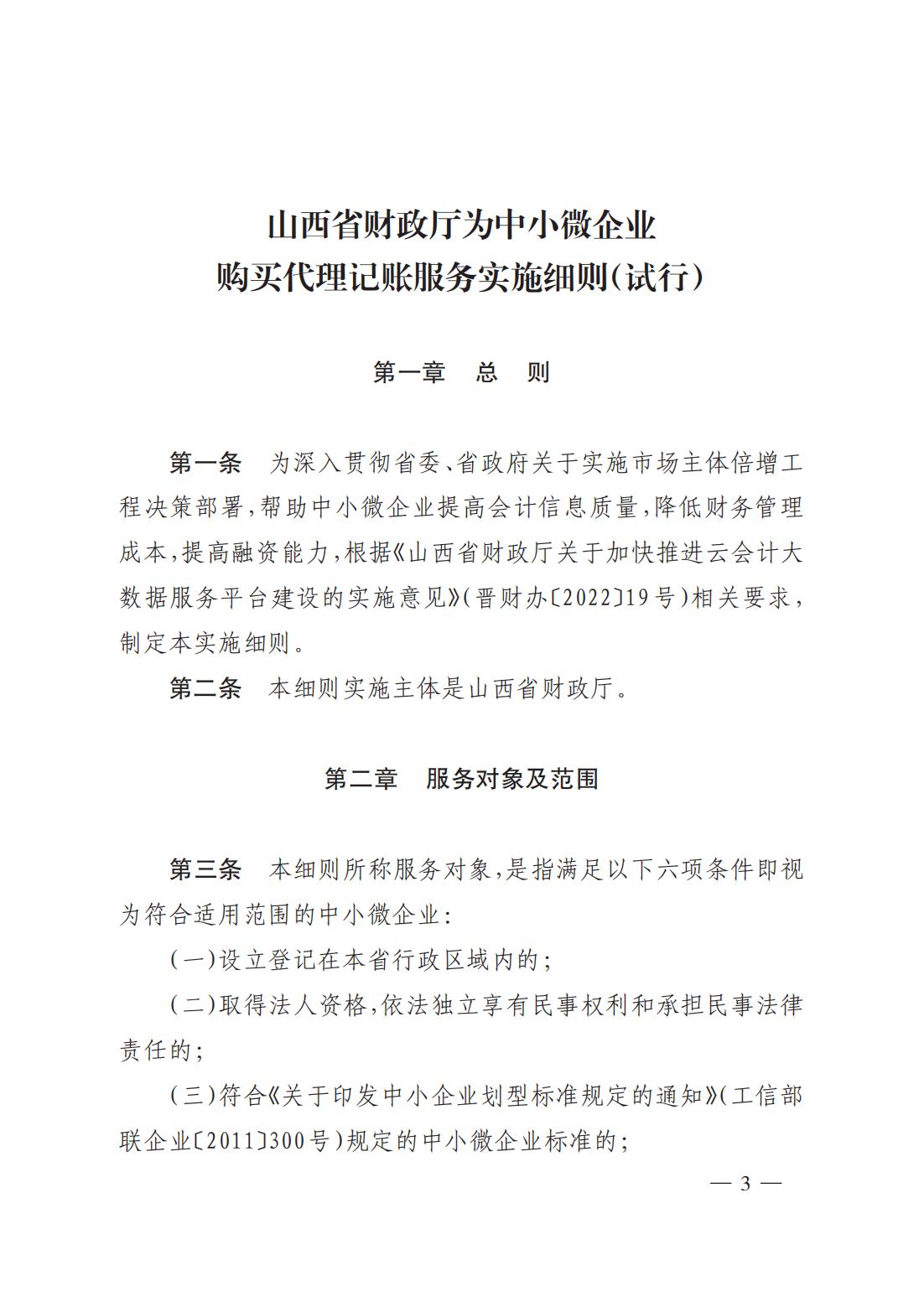 為進(jìn)一步支持全省中小微企業(yè)持續(xù)快速健康發(fā)展,切實(shí)加強(qiáng)和改進(jìn)會(huì)計(jì)服務(wù)能力,根據(jù)《山西省人民政府辦公廳關(guān)于印發(fā)強(qiáng)化市場主體倍增要素服務(wù)保障若干措施(試行)的通知》(晉政辦發(fā)〔2022〕7 號(hào))、《山西省財(cái)政廳關(guān)于加快推進(jìn)云會(huì)計(jì)大數(shù)據(jù)服務(wù)平臺(tái)建設(shè)的實(shí)施意見》(晉財(cái)辦〔2022〕19 號(hào))文件要求,省財(cái)政廳研究制定了《山西省財(cái)政廳為中小微企業(yè)購買代理記賬服務(wù)實(shí)施細(xì)則(試行)》,現(xiàn)予以印發(fā),請結(jié)合工作實(shí)際,認(rèn)真抓好貫徹落實(shí)。